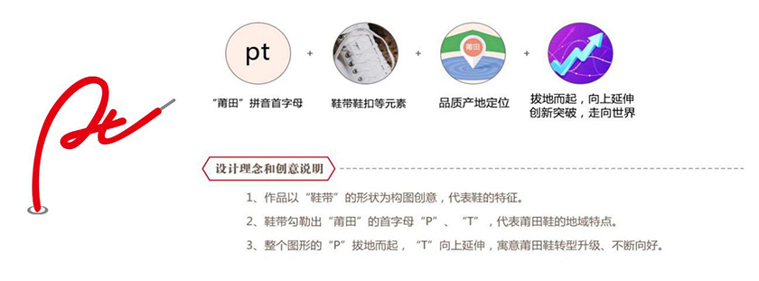LOGO以鞋帶為構(gòu)圖創(chuàng)意,勾勒出莆田兩字的拼音首字母“P”和“T”。圖形“P”拔地而起、“T”向上延伸,既體現(xiàn)鞋的特征,也寓意著莆田鞋業(yè)轉(zhuǎn)型升級(jí)的決心和信心。