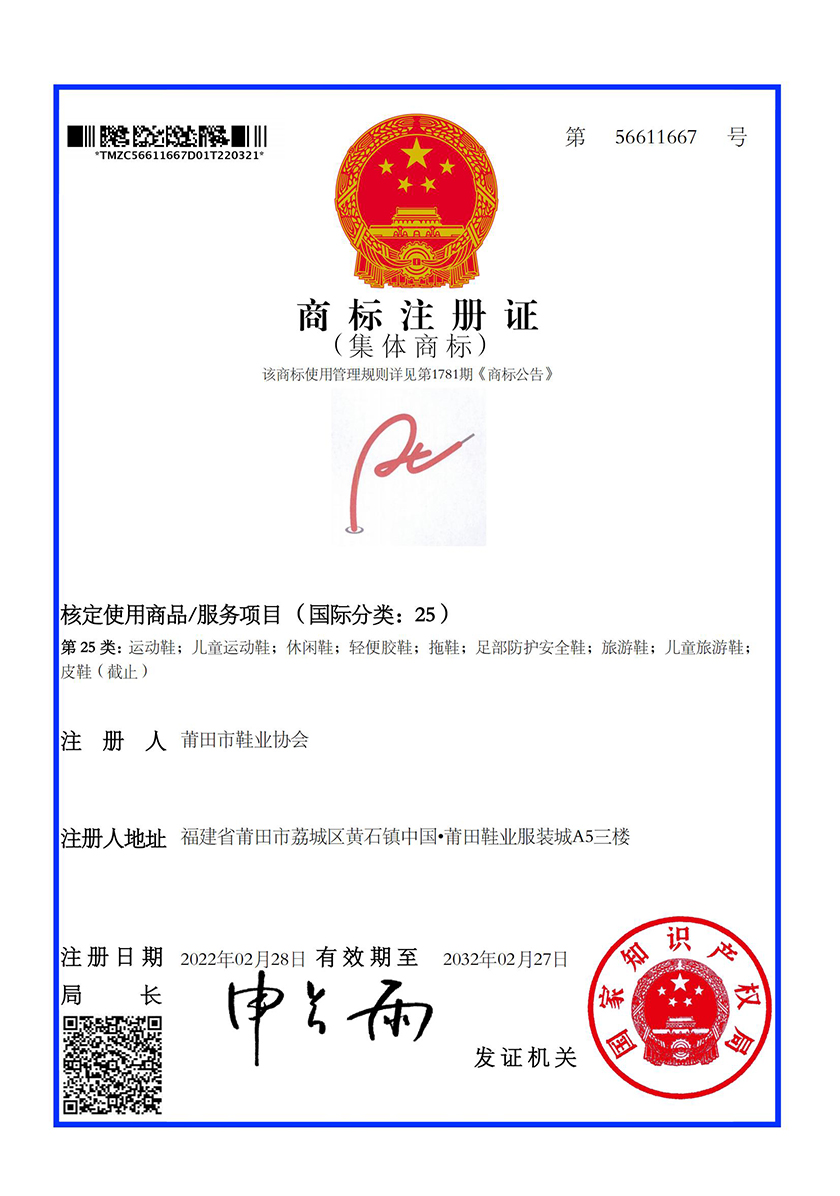 2022年3月,“莆田鞋”集體商標(biāo)(圖形商標(biāo))已獲得國(guó)家知識(shí)產(chǎn)權(quán)局批準(zhǔn)成功注冊(cè)。注冊(cè)日期為2022年2月28日,有效期至2032年2月27日;核定使用商品/服務(wù)項(xiàng)目包括運(yùn)動(dòng)鞋、兒童運(yùn)動(dòng)鞋、休閑鞋、輕便膠鞋、足部防護(hù)安全鞋、旅游鞋、兒童旅游鞋、皮鞋等。